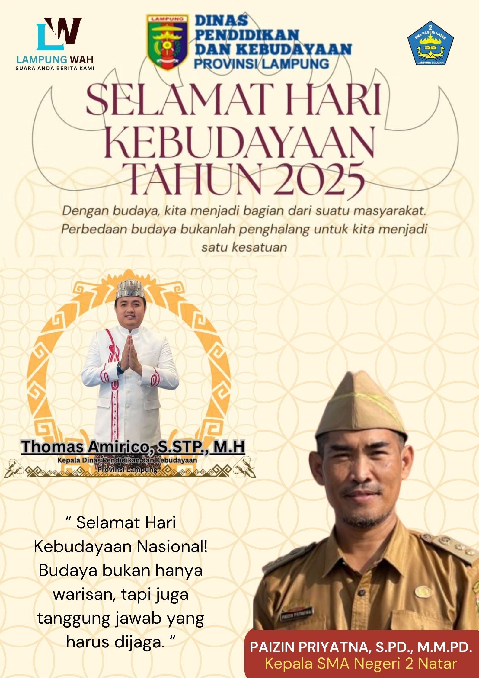 Natar, lintaspena.online — Kepala SMA Negeri 2 Natar, Paizin Priyatna, S.Pd., M.M.Pd., menyampaikan ucapan Selamat Hari Kebudayaan Nasional Tahun 2025 kepada seluruh warga sekolah dan masyarakat. Dalam pernyataannya, beliau menekankan bahwa Hari Kebudayaan 2025 menjadi ruang penumpang, di mana keberagaman bukan sekadar simbol, melainkan kekuatan yang menyatukan. Melalui karya budaya, seni, tradisi, dan dialog lintas budaya, persatuan dalam perbedaan dapat terus dirawat dan diperkuat.