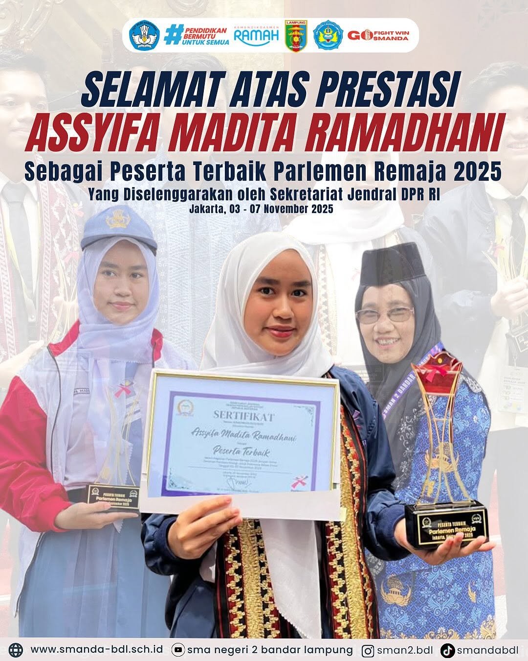 “Kami sangat bangga dengan pencapaian Assyifa. Ini adalah bukti nyata bahwa siswa-siswi SMAN 2 Bandar Lampung memiliki potensi besar dan mampu bersaing di tingkat nasional,” ujarnya, Minggu (30/11/2025).