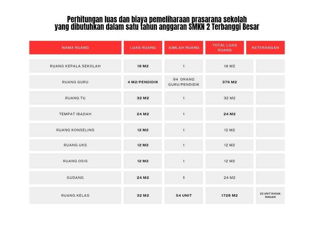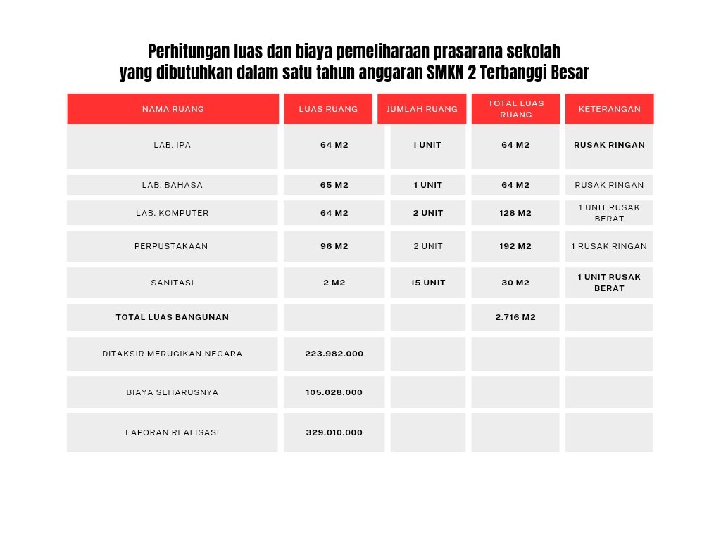 Menurutnya, dengan memiliki ruang dan luas bangunan sekitar 2.716 m2, realisasi dana pemeliharaan sarpras SMKN 2 Terbanggi Besar seharusnya paling banyak hanya menghabiskan dana sekitar Rp 168.392.000 per tahun.