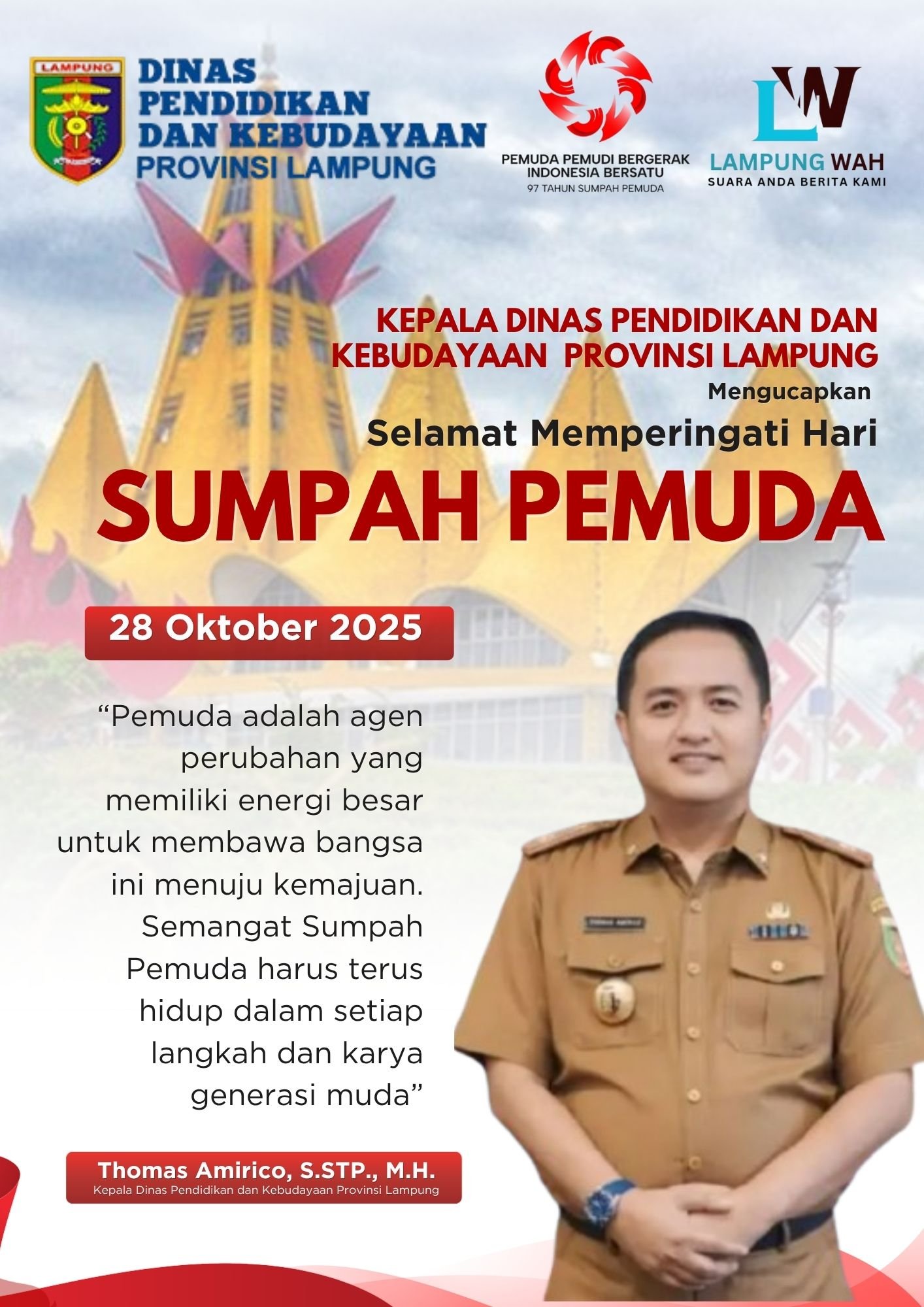 Bandar Lampung, lintaspena.online – Kepala Dinas Pendidikan dan Kebudayaan (Disdikbud) Provinsi Lampung, Thomas Amirico, S.STP., M.H., menyampaikan ucapan selamat memperingati Hari Sumpah Pemuda ke-97 tahun 2025. Ia mengajak seluruh pemuda Indonesia, khususnya di Provinsi Lampung, menjadikan momentum ini untuk memperkuat komitmen bersama dalam menjaga persatuan dan memperkokoh semangat kebangsaan.
