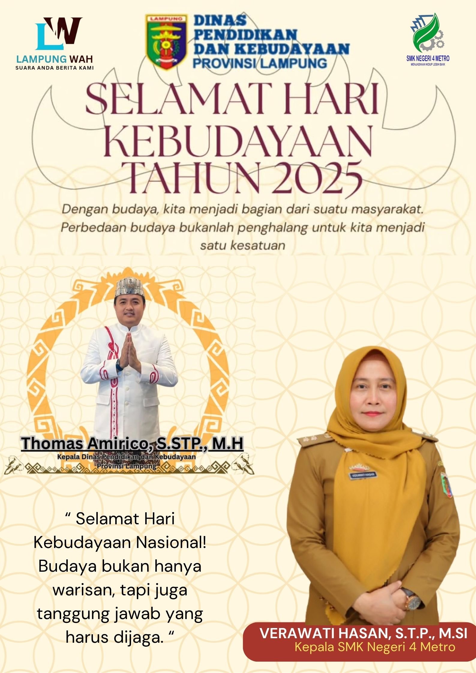Metro, lintaspena.online — Kepala SMK Negeri 4 Metro, VERAWATI HASAN, S.T.P., M.Si, menyampaikan ucapan Selamat Hari Kebudayaan Nasional Tahun 2025 kepada seluruh warga sekolah dan masyarakat.