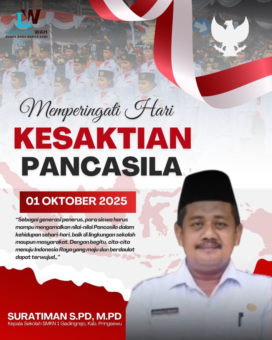 Gadingrejo, lampuwah.info – Dalam rangka memperingati hari Kesaktian Pancasila, Kepala SMK Negeri 1 Gadingrejo,, Suratiman S.Pd, M.Pd., mengucapkan selamat memperingati Hari Kesaktian Pancasila yang jatuh pada 1 Oktober 2025.