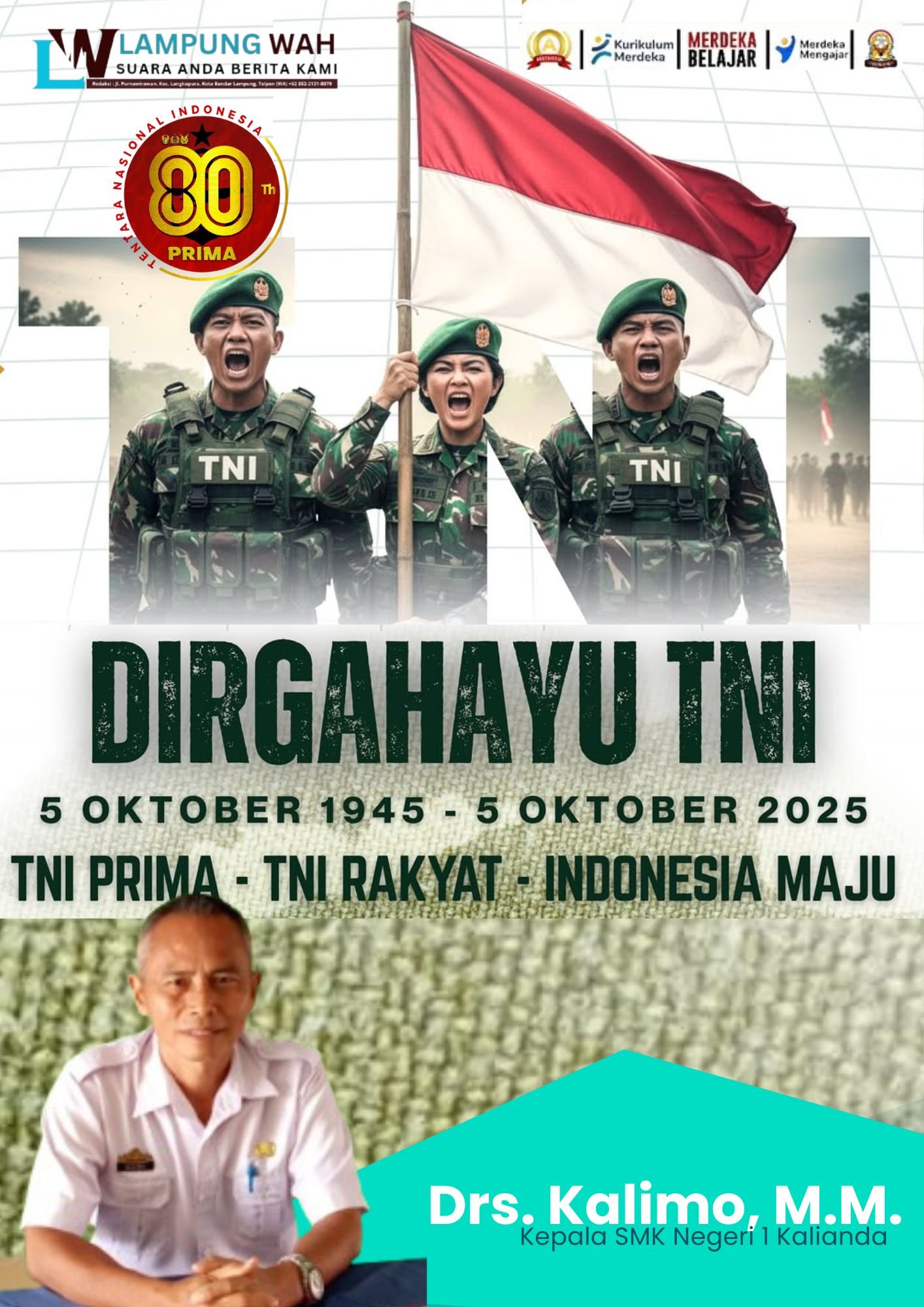 Bandar Lampung, lintaspena.online — Dalam rangka memperingati Hari Ulang Tahun (HUT) Tentara Nasional Indonesia (TNI) ke-80 tahun 2025, kepala SMKN 1 Kalianda, Drs. Kalimo, M.M… mengucapkan Dirgahayu Tentara Nasional Indonesia yang ke-80. Semoga TNI terus menjadi garda terdepan dalam menjaga kedaulatan dan keamanan Negara Kesatuan Republik Indonesia (NKRI), serta terima kasih atas dedikasi dan pengabdian dalam menjaga Indonesia selama 80 tahun.