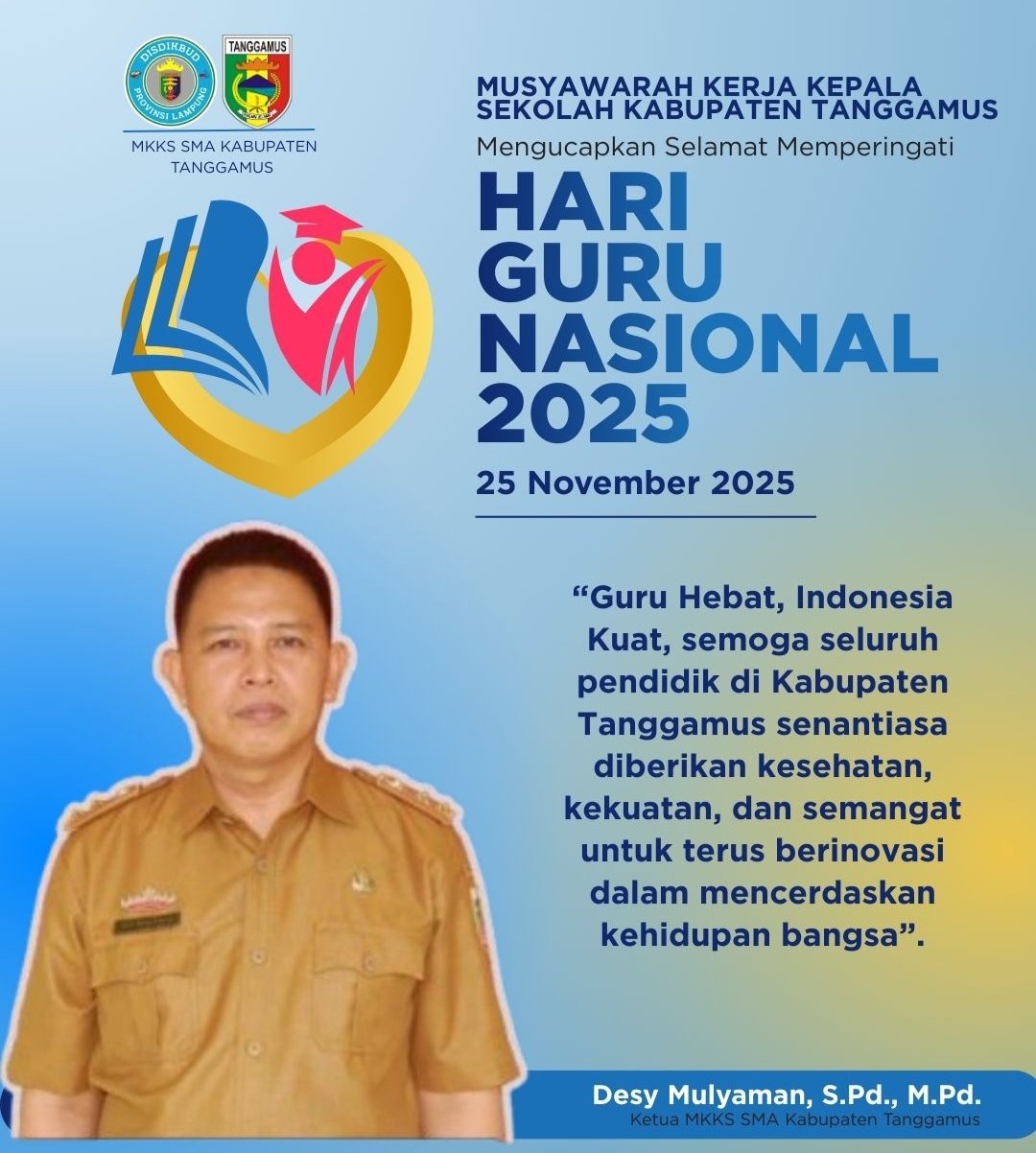 Tanggamus, lintaspena.online – Dalam rangka memperingati Hari Ulang Tahun ke-80 Persatuan Guru Republik Indonesia (PGRI) sekaligus Hari Guru Nasional Tahun 2025, Musyawarah Kerja Kepala Sekolah (MKKS) SMA Kabupaten Tanggamus mengucapkan “Selamat Hari Guru Nasional dan HUT ke-80 PGRI” Dengan semangat “Guru Hebat, Indonesia Kuat, semoga seluruh pendidik di Kabupaten Tanggamus senantiasa diberikan kesehatan, kekuatan, dan semangat untuk terus berinovasi dalam mencerdaskan kehidupan bangsa”.