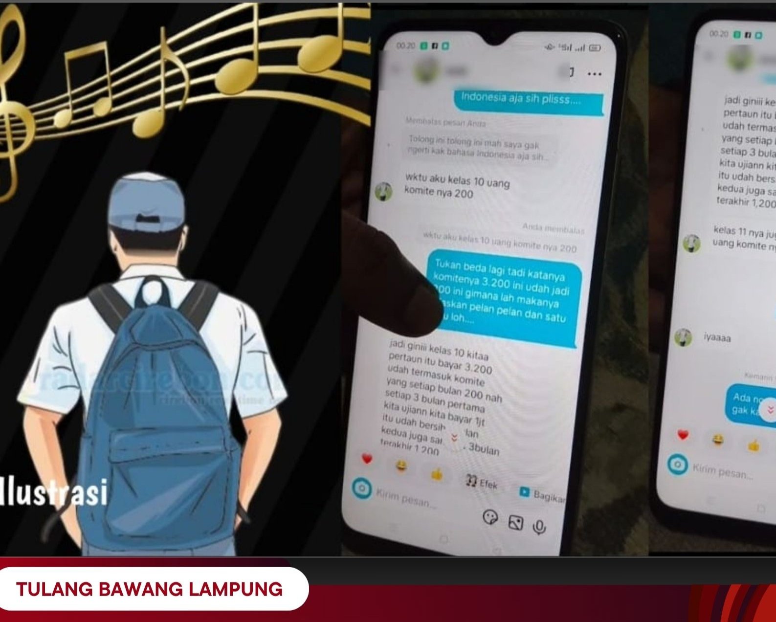 “Jadi gini kelas 10 kita per tahun itu bayar Rp 3,2 juta, udah termasuk uang komite yang setiap bulan Rp 200 ribu. Nah setiap 3 bulan pertama kita ujian, kita bayar Rp 1 juta. 3 bulan ke dua juga sama kita bayar Rp 1 juta dan 3 bulan terakhir bayar Rp 1,2 juta,” Ujar siswa itu dalam teks percakapan dengan Tim Lampung Wah.