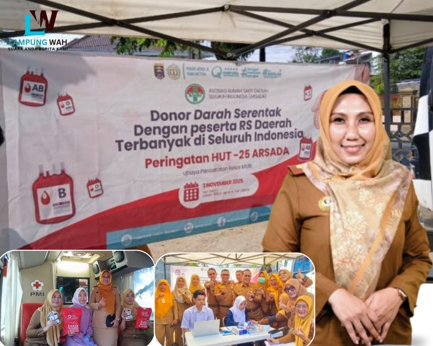 Metro, lintaspena.online – Dalam rangka memperingati Hari Ulang Tahun (HUT) ke-25 Asosiasi Rumah Sakit Daerah Seluruh Indonesia (ARSADA), RSUD Jend. Ahmad Yani Metro melaksanakan kegiatan Donor Darah Serentak Nasional pada Senin (03/11/2025). Kegiatan yang dimulai sejak pukul 08.00 WIB tersebut berlangsung di halaman Kantor RSUD Jend. Ahmad Yani Metro.