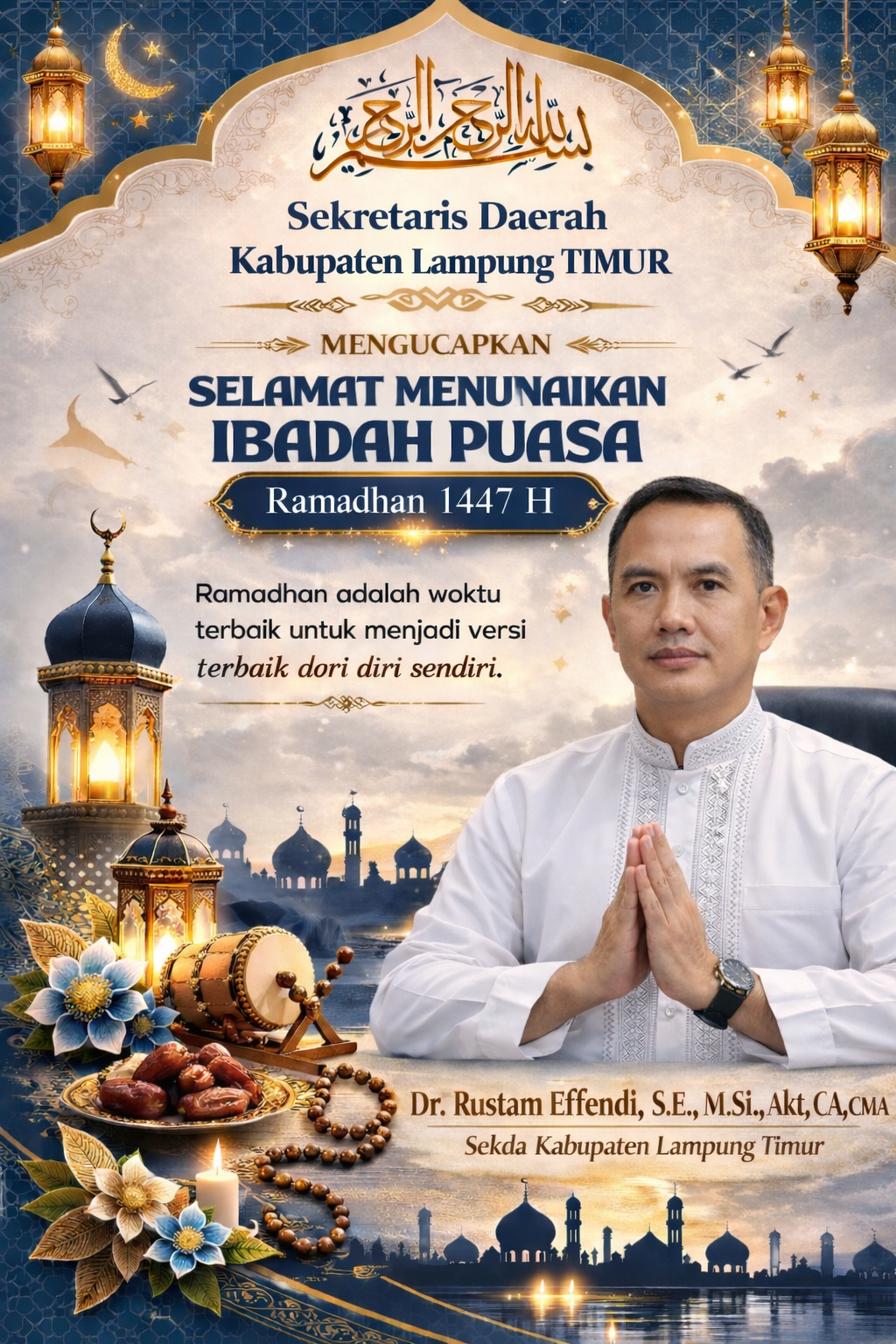 Lampung Timur, lintaspena.online — Menyambut datangnya bulan suci Ramadhan 1447 H, Sekretaris Daerah Kabupaten Lampung Timur, Dr. Rustam Effendi, S.E., M.Si., Akt, CA, CMA, menyampaikan ucapan selamat menunaikan ibadah puasa kepada seluruh umat Islam di Kabupaten Lampung Timur. Dalam pesannya, Sekda menekankan bahwa Ramadhan bukan hanya tentang menahan lapar dan dahaga, tetapi juga momentum untuk memperbaiki diri, memperkuat integritas, serta meningkatkan kepedulian sosial.