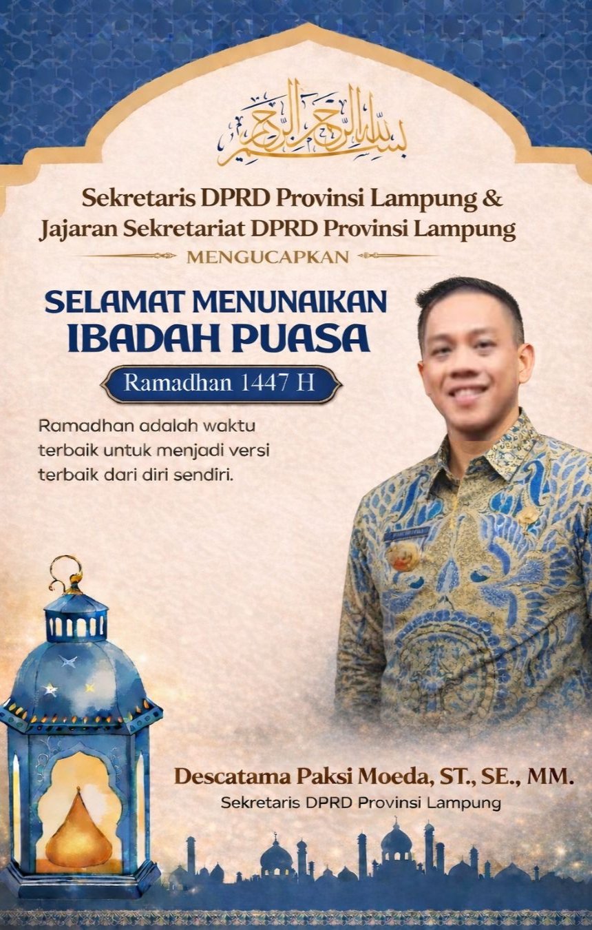 Bandar Lampung, lintaspena.online – Sekretaris DPRD Provinsi Lampung bersama jajaran Sekretariat DPRD Provinsi Lampung menyampaikan ucapan Selamat Menunaikan Ibadah Puasa Ramadhan 1447 Hijriah kepada seluruh masyarakat Lampung, khususnya umat Muslim yang menjalankan ibadah puasa.